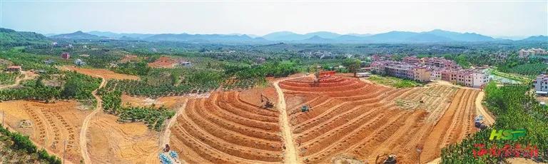 在国家芒果示范基地项目现场,机器声轰鸣不断,工人们顶着烈日紧张施工,大滴汗水浸透衣襟流入土地。从空中俯瞰,刚开挖的梯田层层叠叠高低错落,显出动人的曲线美。然而在短短半个多月前,这里还是一片无规划种植的杂乱土地。